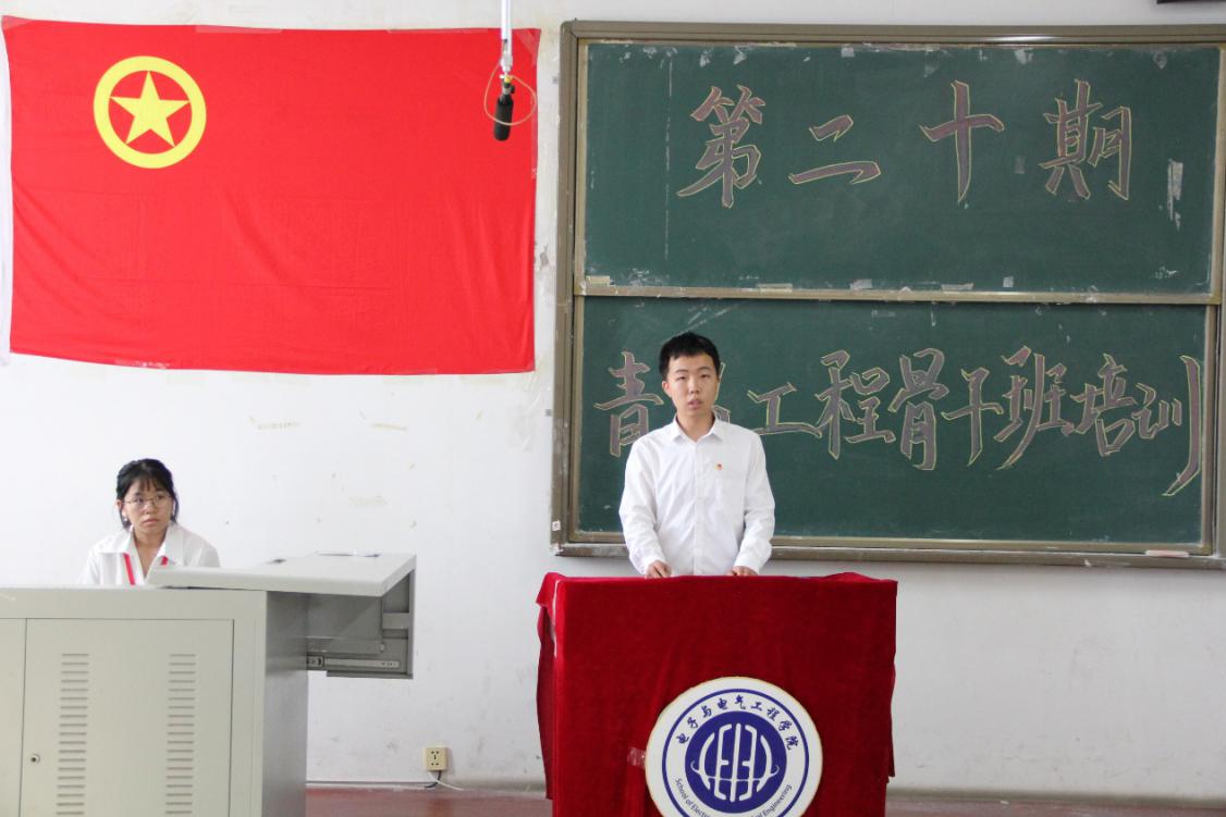 优秀学员代表李鑫洋上台发言,他分享了自己的学习感悟与成长体会,表达了对学院和老师的感激之情,并代表全体学员承诺,将把在青马工程培训中学到的理论知识、锻造的意志品质运用到今后的学习生活中,争做一名坚定的青年马克思主义者。