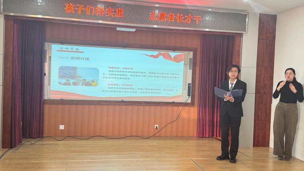随后,大学生志愿者代表苏祺皓围绕活动筹备与目的、活动实施与过程、活动内容与成果、活动总结与收获四个方面作全面汇报。筹备阶段,在指导老师张沧会带领下,志愿者团队结合听力障碍学生的认知特点与学习需求,精心打磨课程,确定《我眼中的美丽校园》、《穿越时空遇见英雄》、《AI+剪映——使诗词“活”起来》三大主题课程,兼顾实用性与教育性。在教学过程中,志愿者们采用“一对一”“手把手”教学模式,根据学生接受能力灵活调整节奏,用耐心与爱心攻克教学难点。汇报现场,大学生志愿者代表苏祺皓通过短片集中展示了特教学生独立完成的短视频作品,生动呈现了孩子们的成长蜕变。此次活动是双向成长的温暖旅程,既帮助特教学生掌握了数字技能,也让志愿者们深刻践行志愿精神,学会用包容传递温暖。