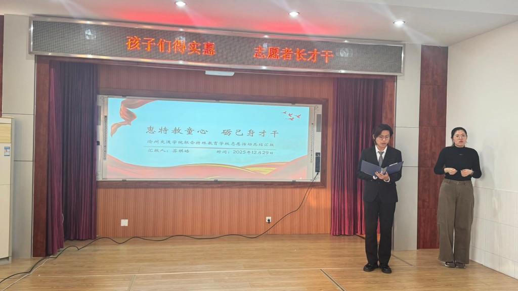 近日,沧州交通学院电子与电气工程学院大学生志愿者团队在黄骅市特殊教育学校开展的数字技能志愿授课活动圆满落幕。在为期两个月的教学实践中,志愿者们秉持耐心陪伴与专业指导相结合的原则,不仅帮助特教学生系统掌握了视频剪辑核心技能,更以数字技术为媒介,为孩子们搭建起一座表达内心世界的全新桥梁。为扎实巩固教学成果、展示志愿成效,2025年12月29日,黄骅市特殊教育学校与沧州交通学院电子与电气工程学院联合举办数字技能志愿授课成果汇报活动,出席本次活动的领导嘉宾有沧州交通学院电子与电气工程学院党总支书记董立伟、黄骅市特殊教育学校校长程建林。活动伊始,程建林校长与董立伟书记先后发表致辞,两位领导的讲话真挚恳切,深刻阐释了本次数字技能志愿授课活动在助力特教学生成长、深化校地协同育人方面的重要意义。