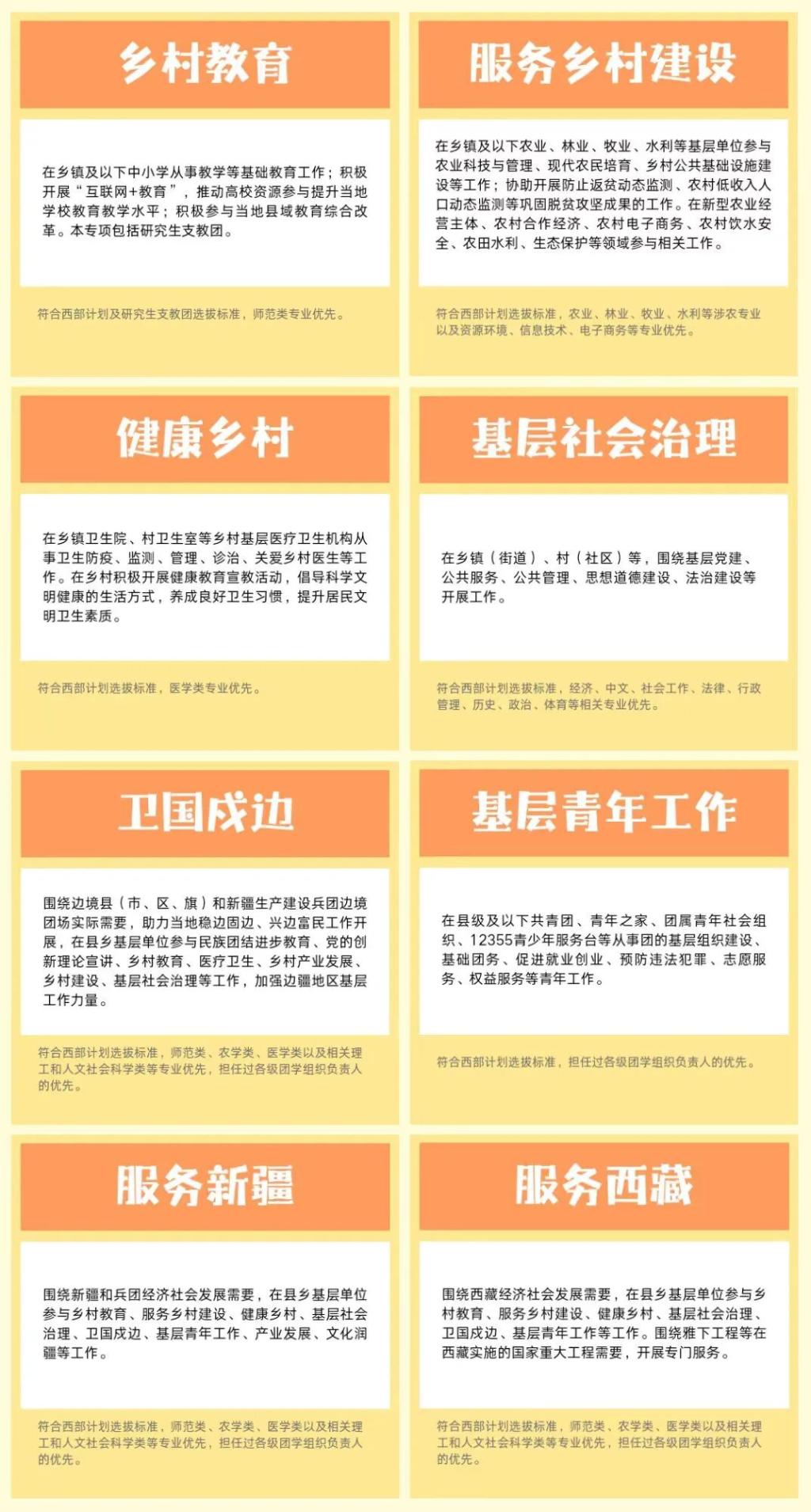 西部计划设置乡村教育、服务乡村建设健康乡村、基层社会治理卫国戍边、基层青年工作服务新疆、服务西藏8个专项西部计划志愿者服务期为1至3年服务协议一年一签
