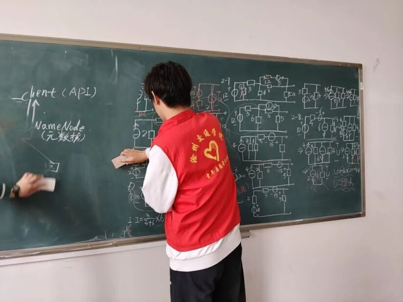 活动期间,志愿者们分组前往图书馆,认真整理书架、归位图书、清理书库积尘,确保阅览环境整洁有序。随后,志愿者们走进教学楼,逐一擦拭黑板、整理讲台、清理课桌垃圾、摆放桌椅,并对多媒体设备进行细致清洁与维护。志愿者们以细致认真的态度投入每一项服务,用实际行动践行“服务他人、提升自我”的志愿理念。