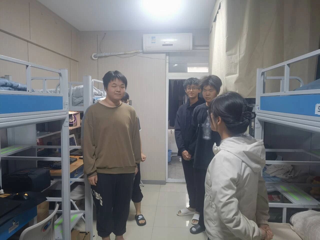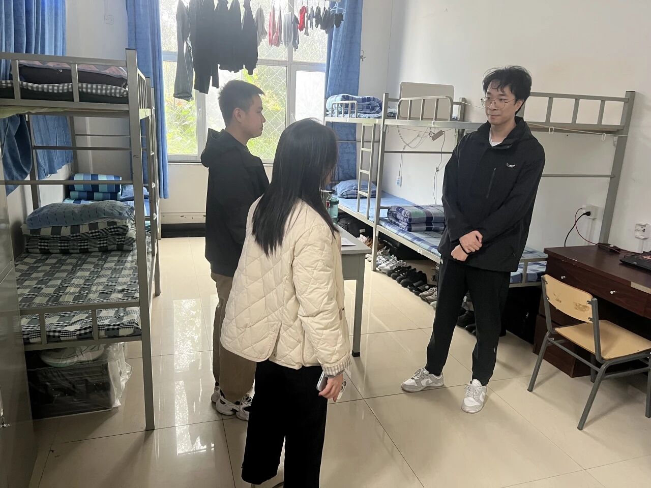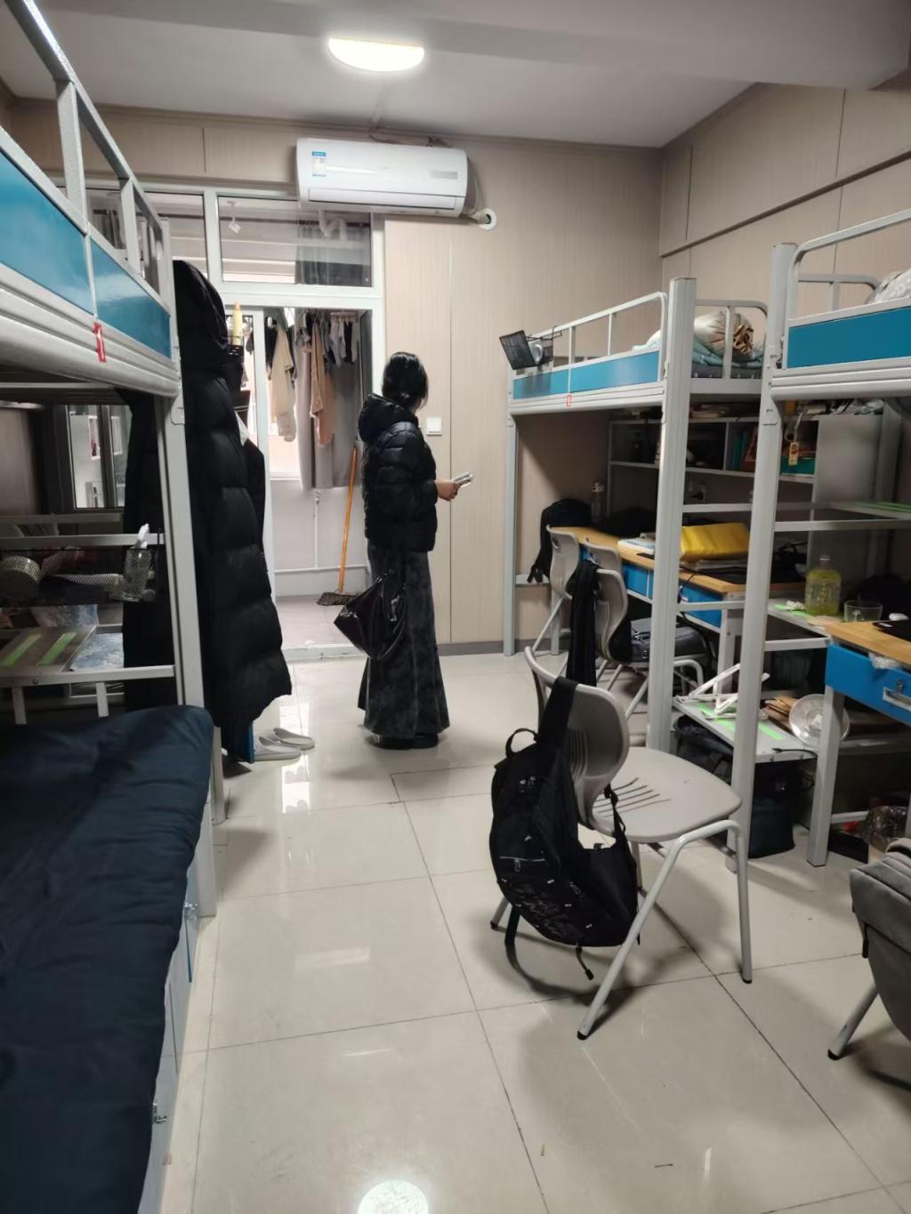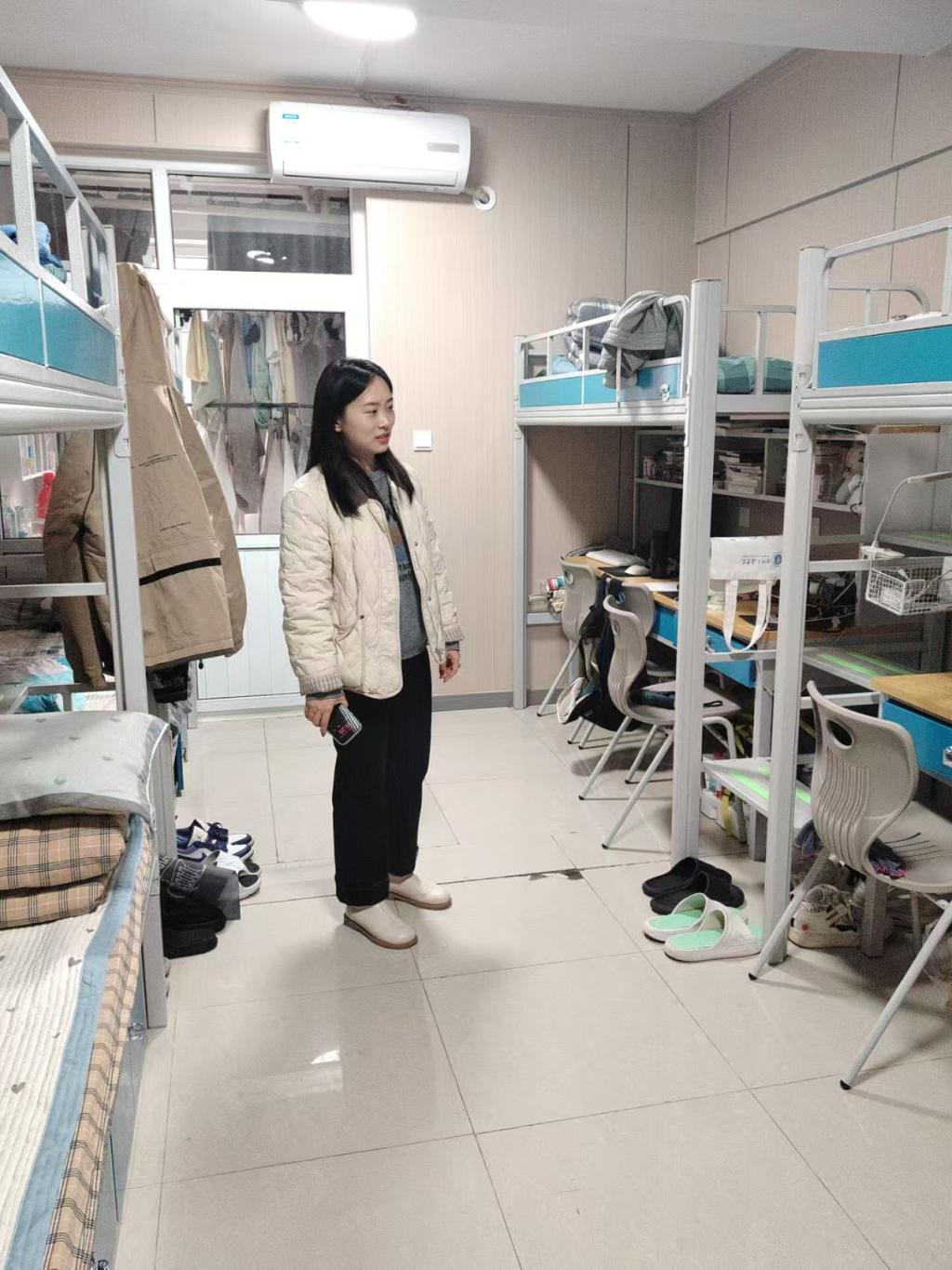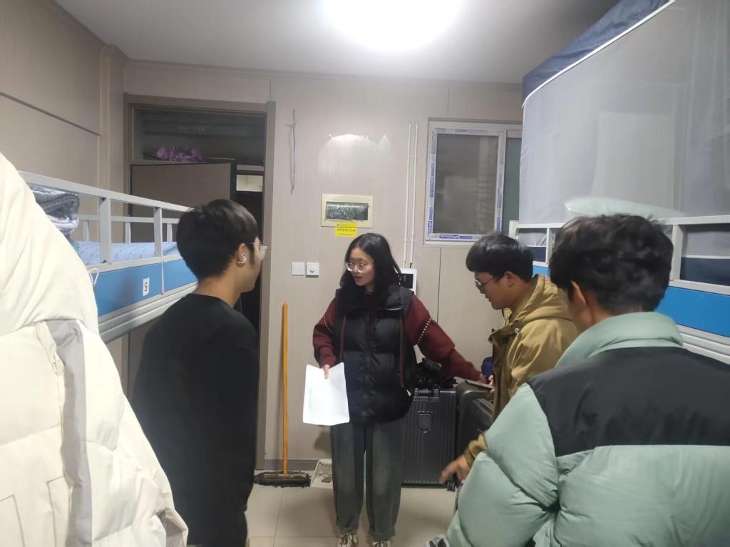走访过程中,老师们轻叩宿舍门、细听学生心声,逐栋逐间走进宿舍。大家细致排查宿舍用电安全、卫生状况及消防设施配备情况,手把手指导学生规范整理物品,及时提醒杜绝违规电器使用、保持宿舍通风整洁;又详细询问学生学习适应进度、生活需求及思想动态,耐心倾听住宿、生活中遇到的难题,对需要后续跟进的事项进行登记。同时,老师们结合校园安全管理要求,反复叮嘱学生增强自我防护意识,养成规律作息与良好卫生习惯,携手打造安全、和谐、温馨的宿舍“小家”。